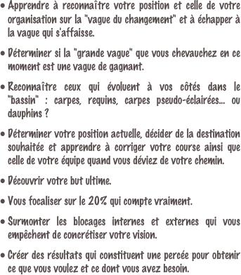 Voici certaines des percées personnelles et organisationnelles qui vous attendent au cours de votre voyage à travers Le PENSERDAUPHIN et à travers les plates-formes d'apprentissage: